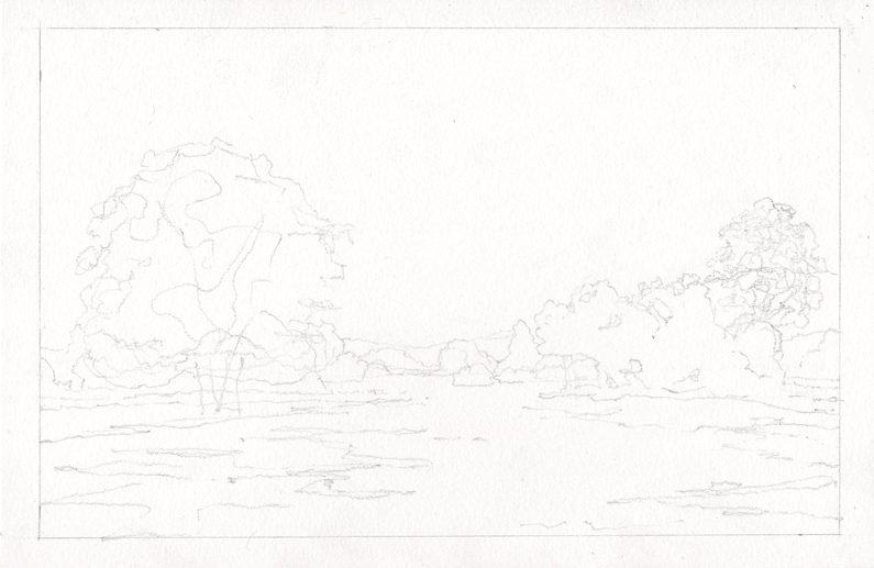 J'ai juste placé rapidement les éléments du paysage au crayon HB, en essayant d'être le plus juste possible.