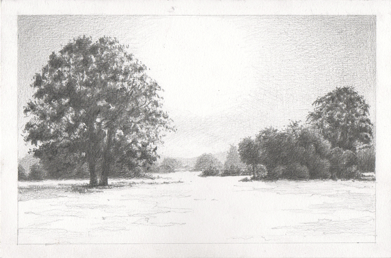 J'ai passé un premier ton sur tous les éléments du paysage, toujours au crayon HB