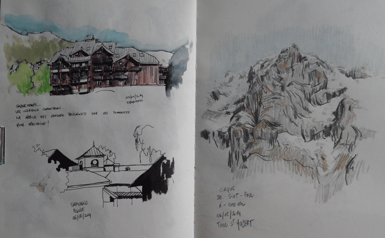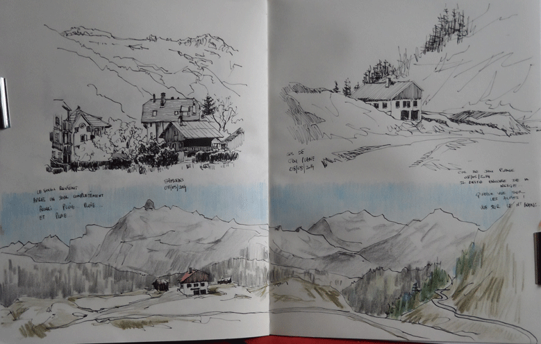J'apprécie beaucoup de découvrir ton carnet de croquis ainsi constitué. C'est très sympa l'apport de l'aquarelle. La diversité du contenu est plaisante aussi. Et la technique toujours riche. C'est un beau concept en tout cas la randocroquis! Je me demande si je ne vais pas m'en faire offrir une pour la fête des mères...