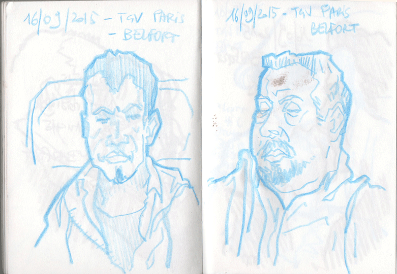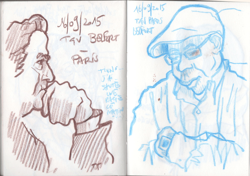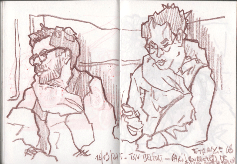 C'est maintenant devenu une habitude... Dès que je pose les fesses dans un train, je sors mon petit carnet de croquis et je croque les gens qui m'entourent...