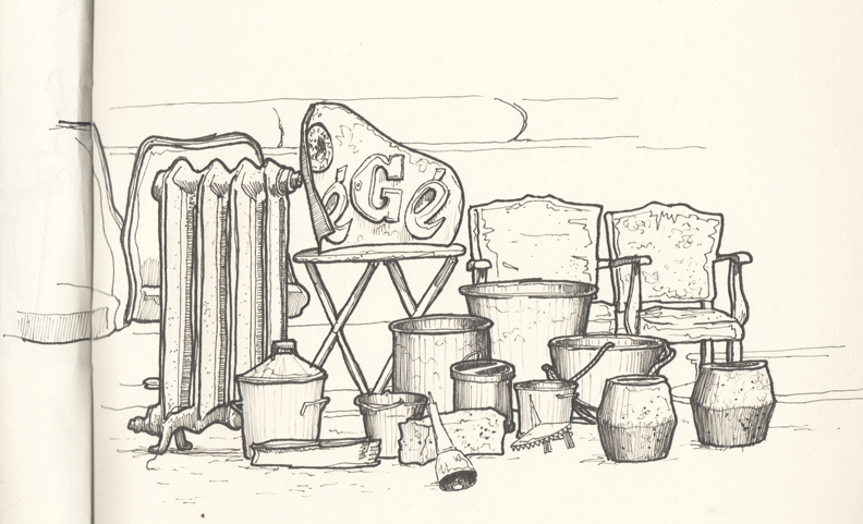 10h ce matin, 4eme matin croquis Devant le kiosque au marché aux puces, il n'y avait pas grand monde pour dessiner... Geneviève et moi-même... Mais pas très motivés quand même... compréhensible: temps gris, du crachin, 6°C, gla gla gla... Le spectacle offert par les différents échoppes nous a fini par nous rebooster! Peu de temps après Myriam nous a rejoint... On a fait de notre mieux, avec nos mains gelées, à nous protéger nos papiers de la pluie, ...
