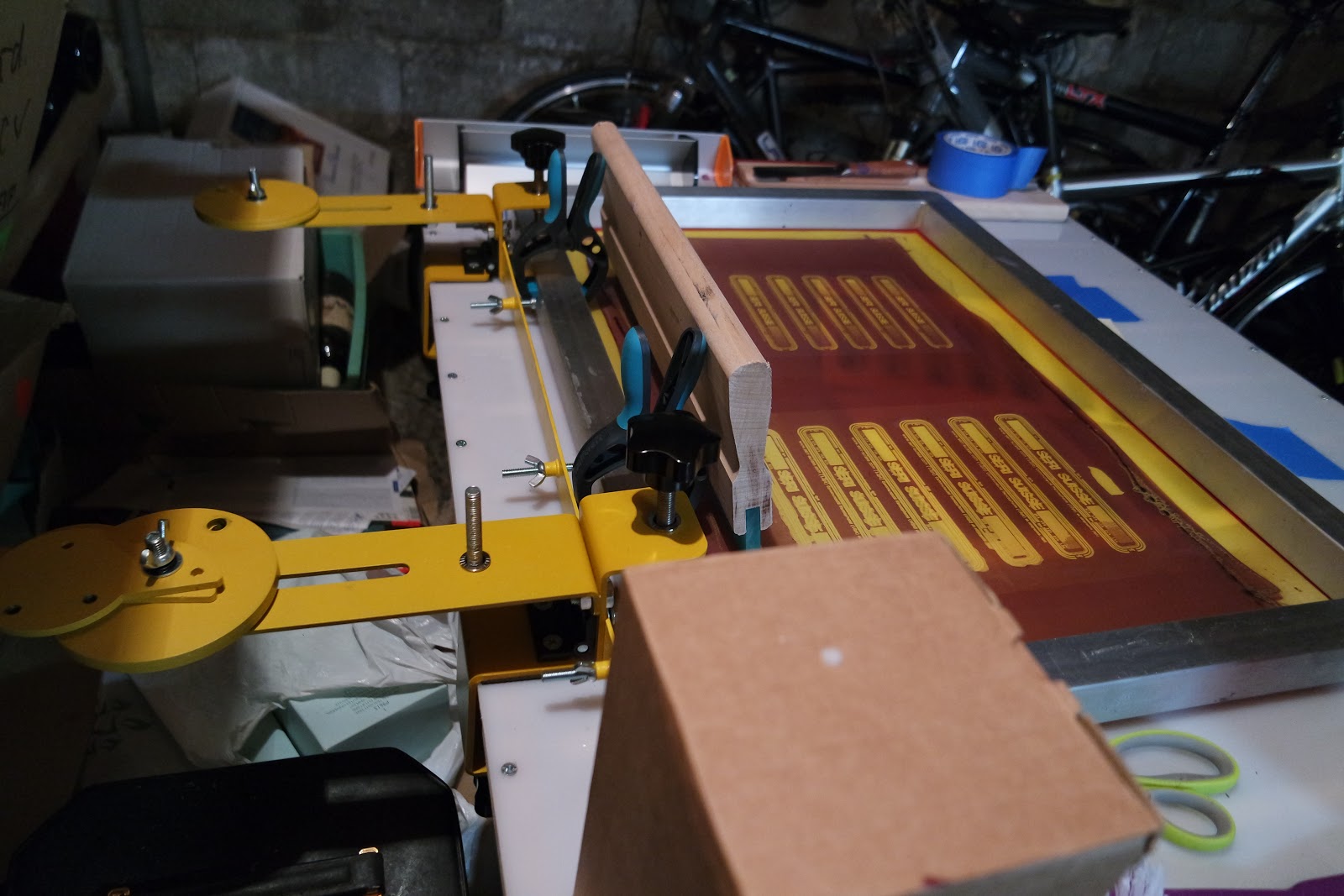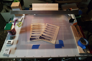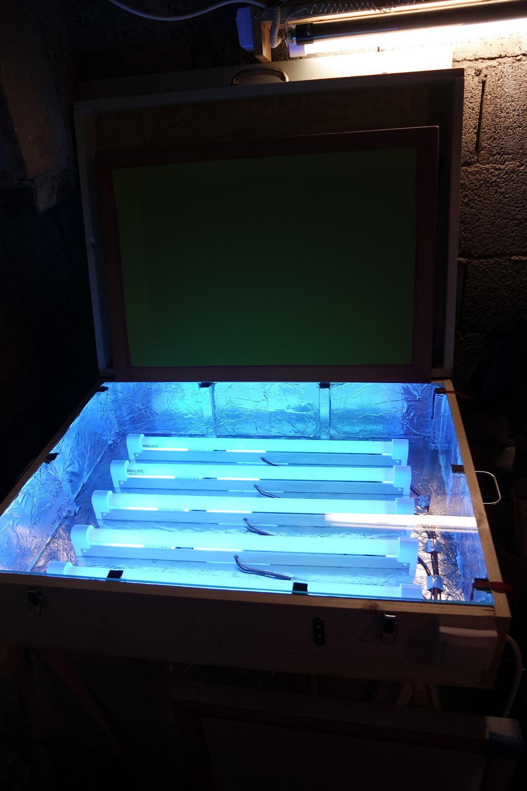 Je viens d'achever la première étape de mon petit atelier de sérigraphie DIY : insoleuse (80 x 60mm) et table aspirante (1000 x 800mm) pour les impressions papier. Les premiers essais sont concluants : 2min30 pour une belle insolation, les détails se révèlent bin, même les très fins. Reste plus qu'à faire une petite presse à tee-shirt. Quelques améliorations à venir : la barre que j'ai installée pour relier mes 2 pinces n'est pas assez rigide.