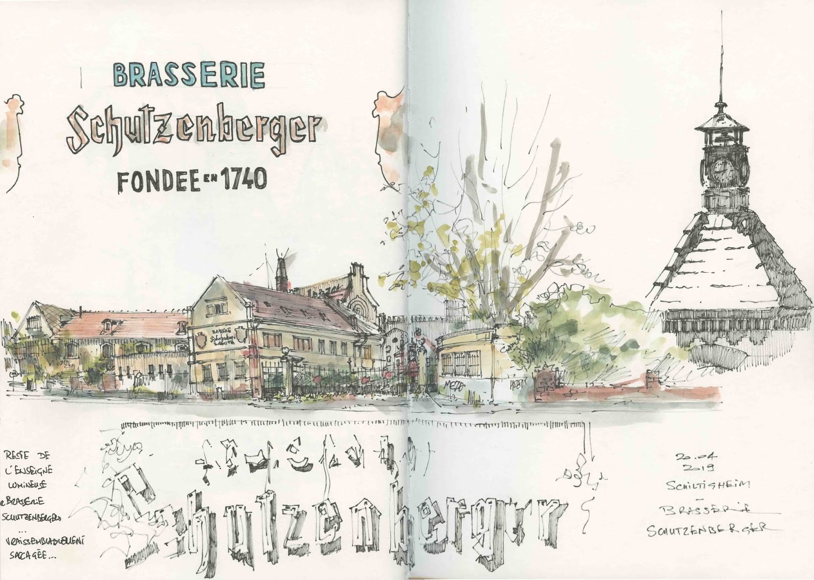 63ème Sketchcrawl à Schiltigheim. Journée bien ensoleillée, ca a fait du bien de dessiner sous cette chaleur… Quelques uns des sketchers présents ont pris des couleurs… ben en fait surtout une… le rouge! Découverte du centre de Schiltigheim, qui a su conserver ses maisons à colombage, qui n'a pas succombé au tout béton. Ensuite découverte des friches industrielles des anciennes brasseries : Schutzenberger, Fischer.
