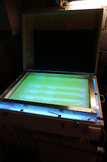 Je viens d'achever la première étape de mon petit atelier de sérigraphie DIY : insoleuse (80 x 60mm) et table aspirante (1000 x 800mm) pour les impressions papier. Les premiers essais sont concluants : 2min30 pour une belle insolation, les détails se révèlent bin, même les très fins. Reste plus qu'à faire une petite presse à tee-shirt. Quelques améliorations à venir : la barre que j'ai installée pour relier mes 2 pinces n'est pas assez rigide.